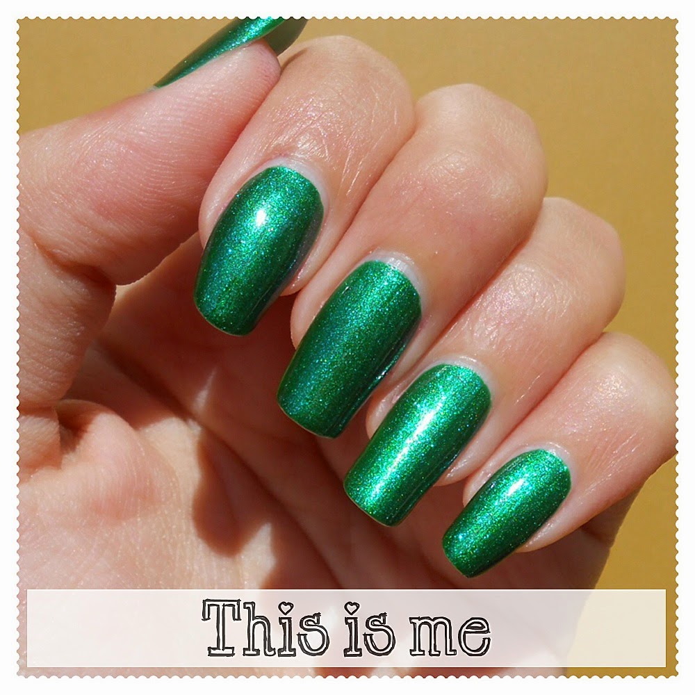 È un bel verde trifoglio, ed ha dei piccoli flakie azzurri e verde chiaro; nella boccetta si nota anche una punta di lilla, ma una volta steso sulle unghie quella tonalità non si riesce più a vedere. I flakie gli conferiscono una finitura glass flake.